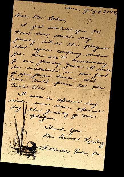 “I just wanted you to know how much my family liked the plaque that your company [designed] for the 200th anniversary of our family farm. It will be installed on the front of the farm house that was built prior to the civil war. It was a special day made even more special by the quality of ‘our’ plaque. Thank You.”
