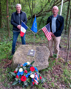 I just wanted to let you know that your handiwork is still honoring my dad, still in very good condition, and still telling the story. I was fortunate to be able to visit the memorial in France last year and I can report the plaque still looks as good as it did 9 years ago. My friends visited the memorial yesterday, V/E Day, as they do every year, and placed flowers to dress it up in celebration. I am attaching the photo of the mayors of the two little villages who attended the annual ceremony.